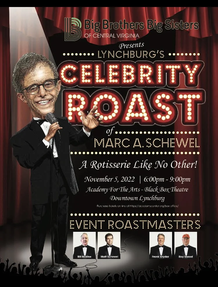 Join us for the first ever Lynchburg Celebrity Roast starring native son, Marc Schewel. An ALL-STAR cast including family, co-workers and life-long friends will pay “tribute” to Marc, guaranteeing an evening full of outrageous laughs and roaring good time!